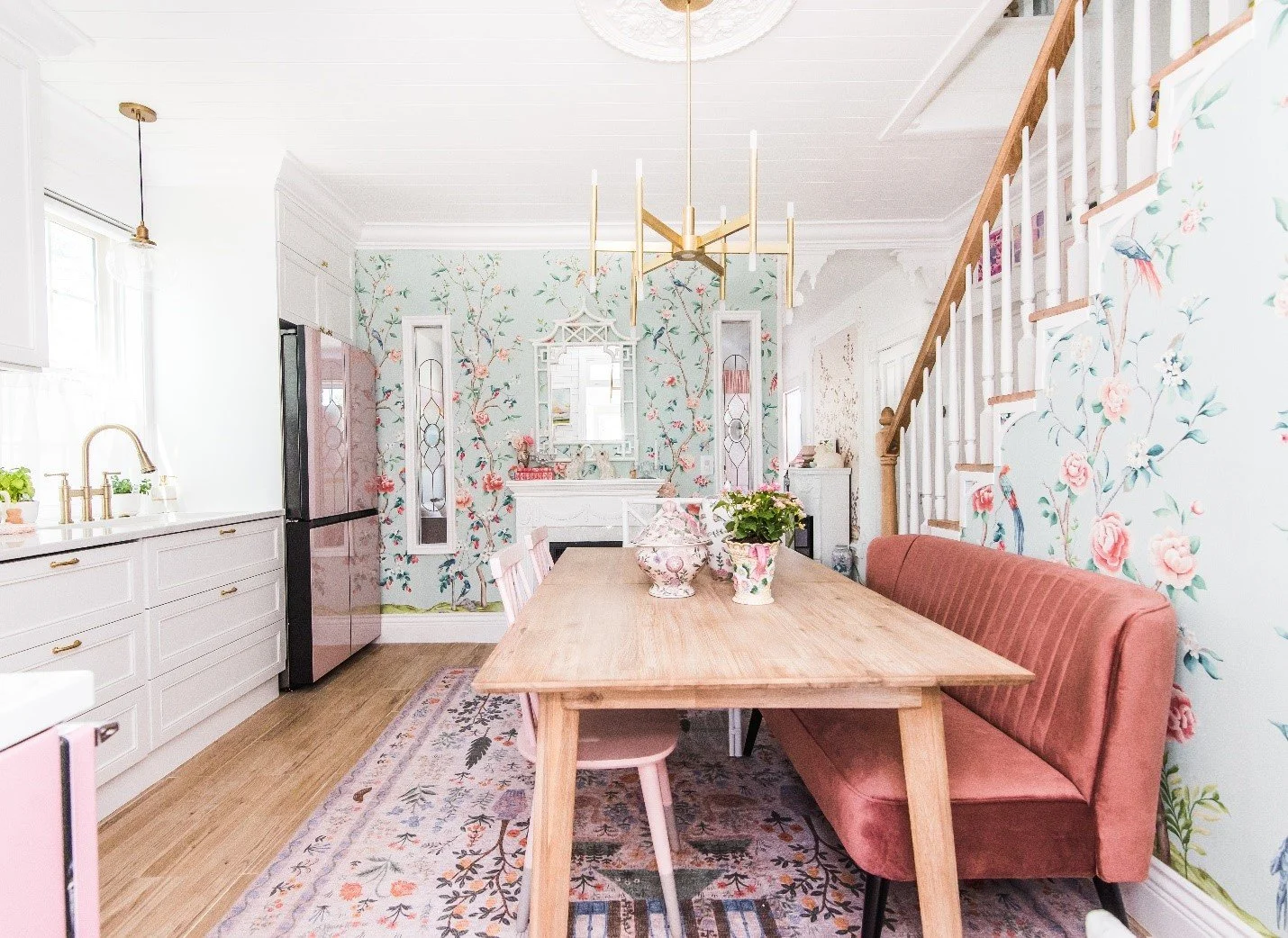 Ashley Wilson also designed a charming kitchen makeover in this narrow room. In an unusual move, she added a velvet settee against the stair wall with chairs on the opposite side of a long table—also a good backup prep area. Ashley chose a scenic wallpaper mural that makes the whole room seem like a floral garden in bloom.