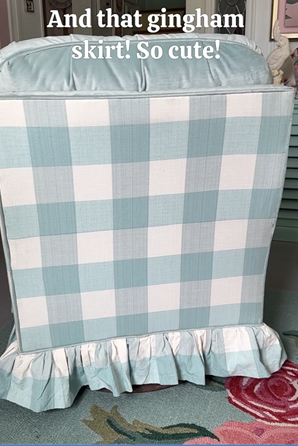 At Calico, Ashley easily found fabrics that suited her feminine style of decorating. She loved the large gingham check, but her husband didn’t want a fabric with any white areas on the seat. The Calico designer suggested a solution: a second fabric for the inside of the chair!