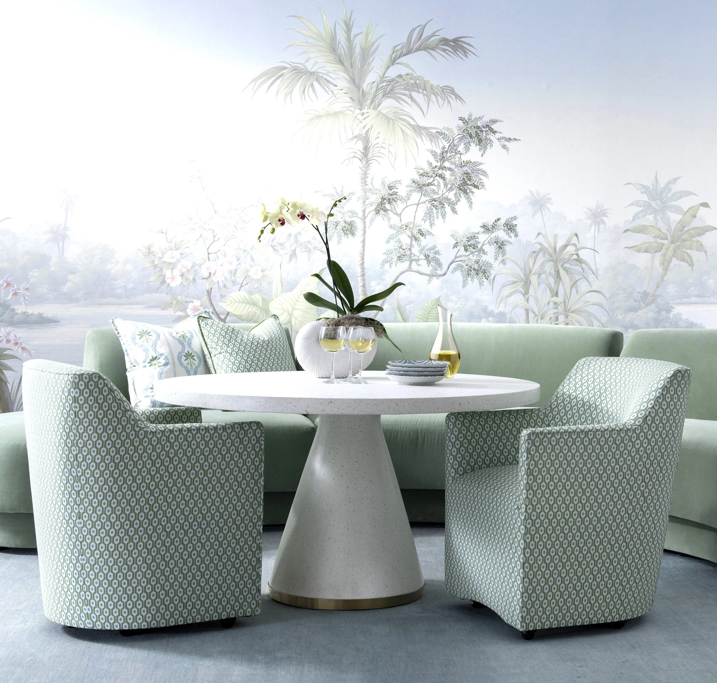 Swivel chairs are covered in the ikat go-with print Moselle in Green—a design that works most anywhere.